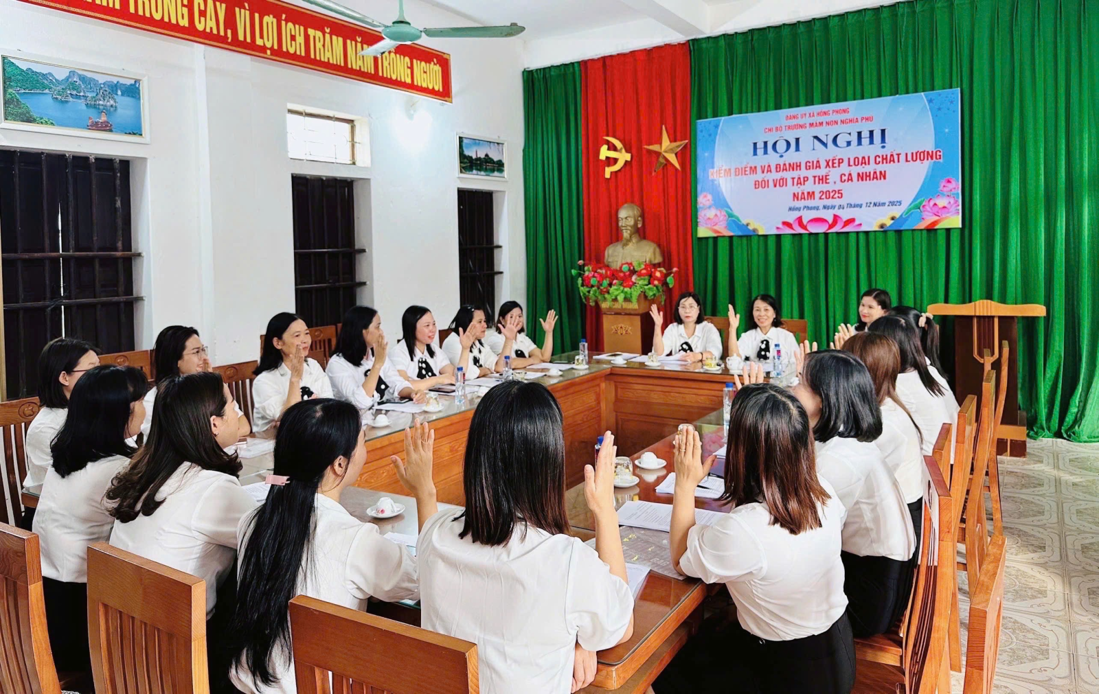 Chiều ngày 04/12/2025, Chi bộ Trường Mầm non Nghĩa Phú đã long trọng tổ chức Hội nghị kiểm điểm, đánh giá, xếp loại chất lượng đối với tập thể, cá nhân đảng viên năm 2025 theo đúng kế hoạch, hướng dẫn của Đảng ủy xã Hồng Phong.