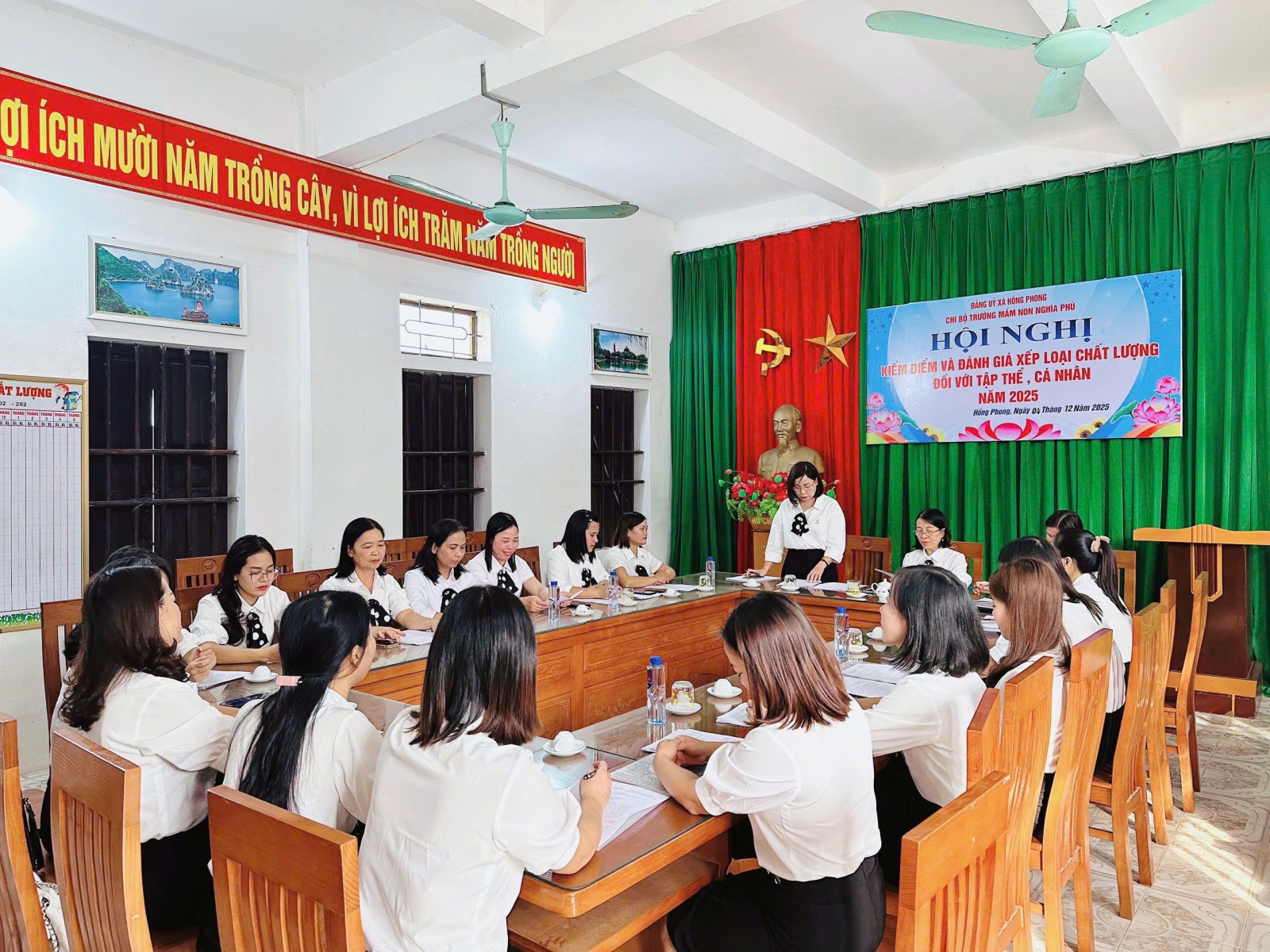 Chiều ngày 04/12/2025, Chi bộ Trường Mầm non Nghĩa Phú đã long trọng tổ chức Hội nghị kiểm điểm, đánh giá, xếp loại chất lượng đối với tập thể, cá nhân đảng viên năm 2025 theo đúng kế hoạch, hướng dẫn của Đảng ủy xã Hồng Phong.