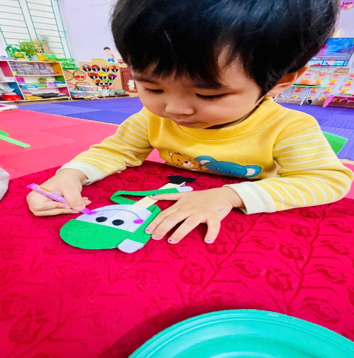 Sau đó, trẻ được cô hướng dẫn cách tạo hình: lựa chọn giấy màu, cắt – dán khuôn mặt, trang phục, mũ và trang trí thêm lá cờ đỏ sao vàng . Dù đôi tay nhỏ còn vụng về, nhưng các con lại rất say mê, tỉ mỉ và hào hứng. Mỗi sản phẩm đều mang nét đáng yêu, thể hiện cảm xúc của trẻ dành cho hình tượng người chiến sĩ.